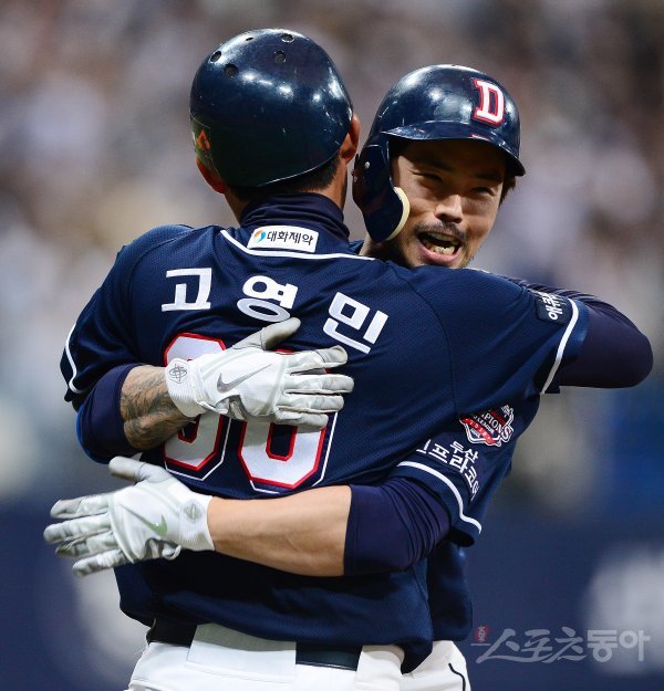 26일 서울 고척스카이돔에서 ‘2019 신한은행 MY CAR KBO 포스트시즌’ 한국시리즈 4차전 두산 베어스와 키움 히어로즈의 경기가 열렸다. 두산 오재원이 5회초 2사 만루에서 역전 2타점 적시타를 친 후 고영민 코치와 포옹을 나누고 있다.