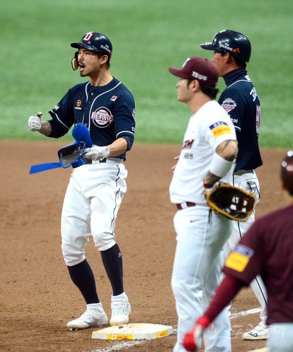 26일 서울 고척스카이돔에서 ‘2019 신한은행 MY CAR KBO 포스트시즌’ 두산 베어스와 키움 히어로즈의 한국시리즈 4차전이 열렸다. 5회초 2사 만루 두산 오재원이 역전 2타점 적시타를 치고 1루에서 환호하고 있다.