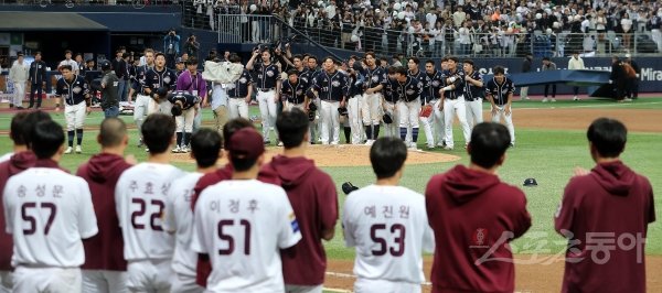26일 서울 고척스카이돔에서 열린 ‘2019 신한은행 MY CAR KBO 포스트시즌’ 한국시리즈 4차전 두산 베어스와 키움 히어로즈의 경기에서 두산이 연장 접전 끝에 11-9로 승리, 시리즈 전적 4승으로 한국시리즈 여섯 번째 우승과 함께 통산 세 번째 통합 우승을 이뤄냈다. 경기 후 두산 선수들이 키움 선수단의 축하 박수에 고개 숙여 인사를 하고 있다.