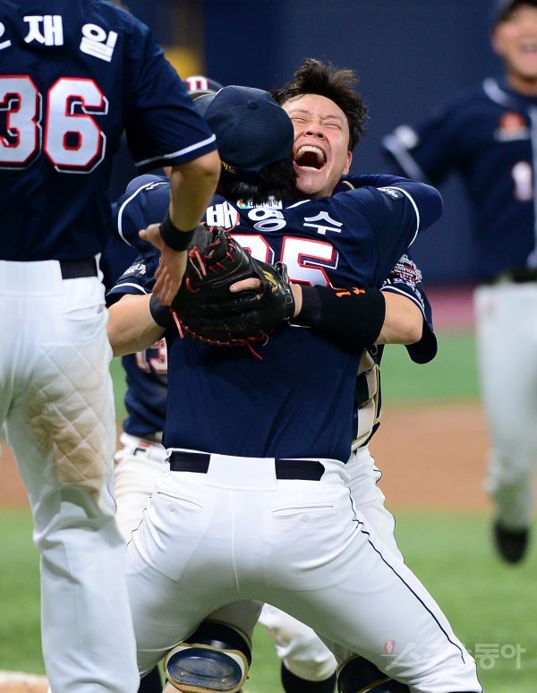 26일 서울 고척스카이돔에서 열린 ‘2019 신한은행 MY CAR KBO 포스트시즌’ 한국시리즈 4차전 두산 베어스와 키움 히어로즈의 경기에서 두산이 연장 접전 끝에 11-9로 승리, 시리즈 전적 4승으로 한국시리즈 여섯 번째 우승과 함께 통산 세 번째 통합 우승을 이뤄냈다. 두산 박세혁이 경기가 종료된 후 배영수와 기쁨을 나누고 있다.