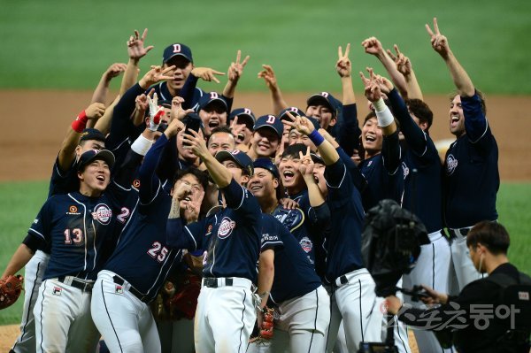 26일 서울 고척스카이돔에서 ‘2019 신한은행 MY CAR KBO 포스트시즌’ 두산 베어스와 키움 히어로즈의 한국시리즈 4차전이 열렸다. 두산이 11-9 역전승을 거두며 시리즈 전적 4승 무패로 통합우승을 차지했다. 선수들이 환호하고 있다.