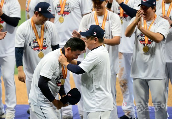 26일 서울 고척스카이돔에서 ‘2019 신한은행 MY CAR KBO 포스트시즌’ 두산 베어스와 키움 히어로즈의 한국시리즈 4차전이 열렸다. 두산이 11-9 역전승을 거두며 시리즈 전적 4승 무패로 통합우승을 차지했다. 김태형 감독이 정재훈 코치에게 메달을 걸어주고 있다.