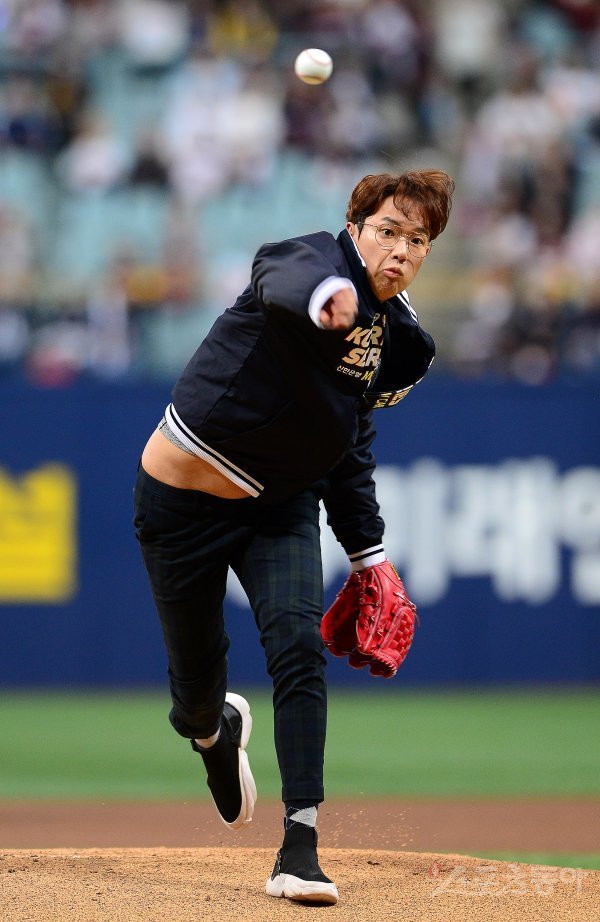 26일 서울 고척스카이돔에서 ‘2019 신한은행 MY CAR KBO 포스트시즌’ 한국시리즈 4차전 두산 베어스와 키움 히어로즈의 경기가 열렸다. 방송인 장성규가 경기 전 열린 시구행사에서 힘차게 공을 던지고 있다.