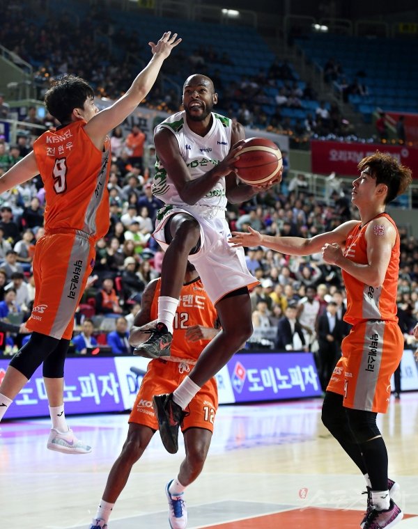 27일 인천 삼산월드체육관에서 열린 ‘2019-2020 현대모비스 프로농구’ 인천 전자랜드와 원주 DB의 경기에서 DB 그린이 전자랜드 전현우의 수비를 피해 슛을 쏘고 있다.