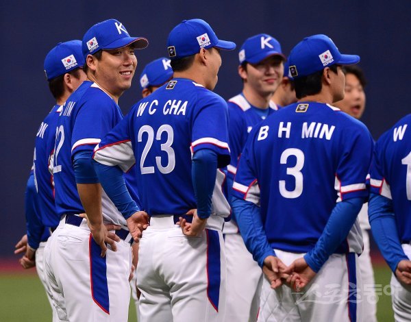 김현수(왼쪽)를 비롯한 대표팀 선수들이 한자리에 모여 코칭스테프의 지시 사항을 듣고 있다.