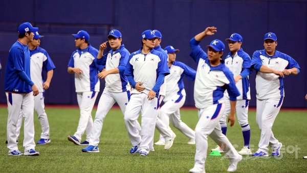 29일 서울 고척스카이돔에서 한국야구대표팀이 훈련을 가졌다. 야구대표팀 선수들이 스트레칭 훈련을 하고 있다.