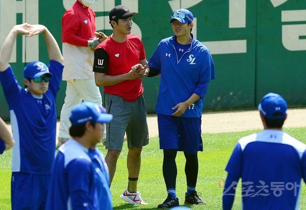 경기 전 SK 박종훈과 삼성 김대우가 이야기를 나누고 있다.