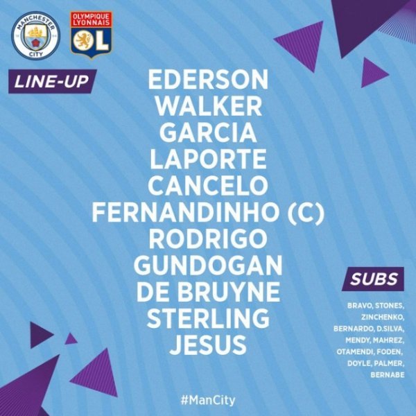 잉글리시 프리미어리그 맨체스터 시티(이하 맨시티)가 프랑스 리그1 올림피크 리옹과의 챔피언스리그 8강전 선발 라인업을 공개했다.