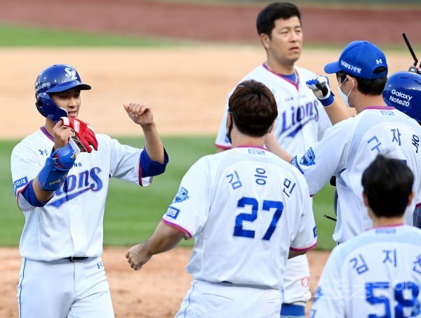 1일 대구 삼성라이온즈파크에서 ‘2020 신한은행 SOL KBO리그’ 삼성 라이온즈와 kt 위즈의 경기가 열렸다. 연장 10회말 1사 1, 루에서 삼성 강한울이 끝내기 안타를 날린 뒤 동료들의 환영을 받고 있다.