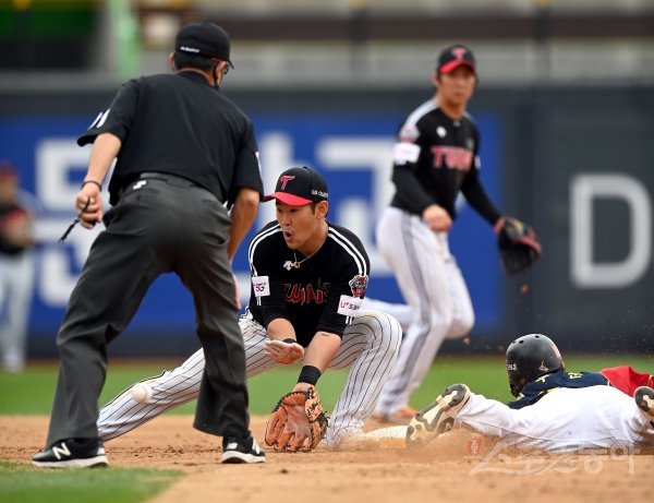 4일 수원 KT위즈파크에서 ‘2020 신한은행 SOL KBO 리그’ LG 트윈스와 KT 위즈 경기가 열렸다. 4회말 1사 1,2루 상황에서 KT 1루주자 심우준이 2루 도루에 성공하고 있다.