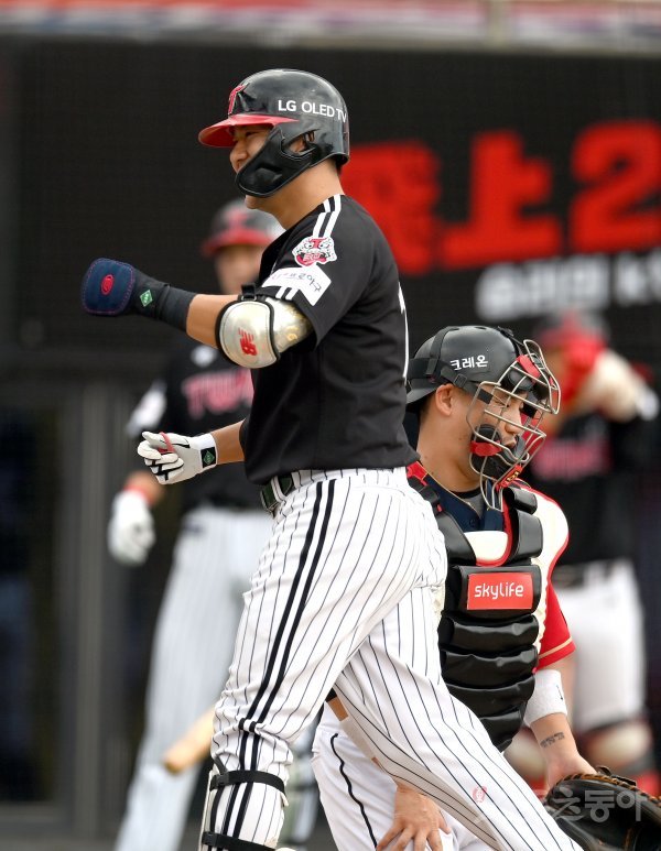 4일 수원 KT위즈파크에서 ‘2020 신한은행 SOL KBO 리그’ LG 트윈스와 KT 위즈 경기가 열렸다. 3회초 2사 1,2루 LG 김민성이 좌월 스러런 홈런을 날리고 그라운드를 돌며 하이파이브하고 있다.