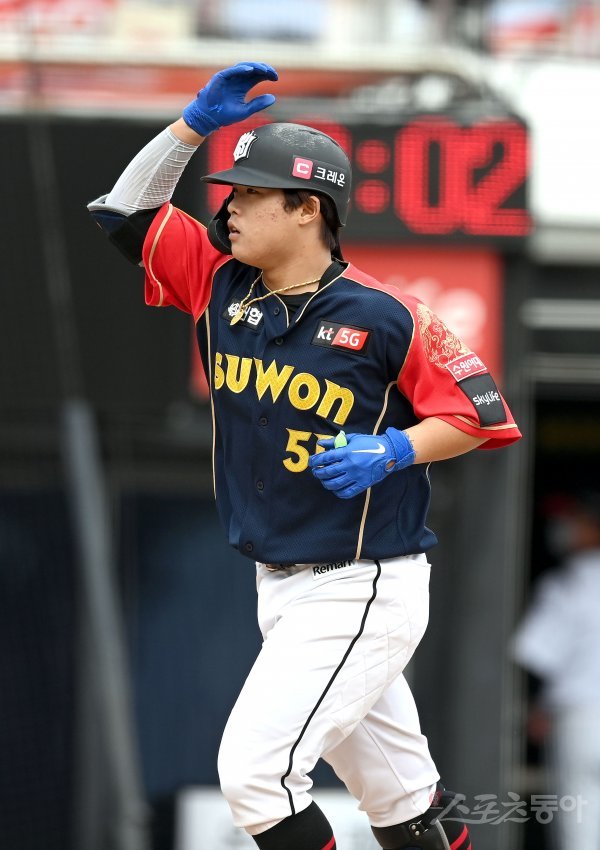 5회말 무사 1루 KT 강백호가 좌월 투런 홈런을 날리고 그라운들 돌아 홈인해 하이파이브하고 있다.