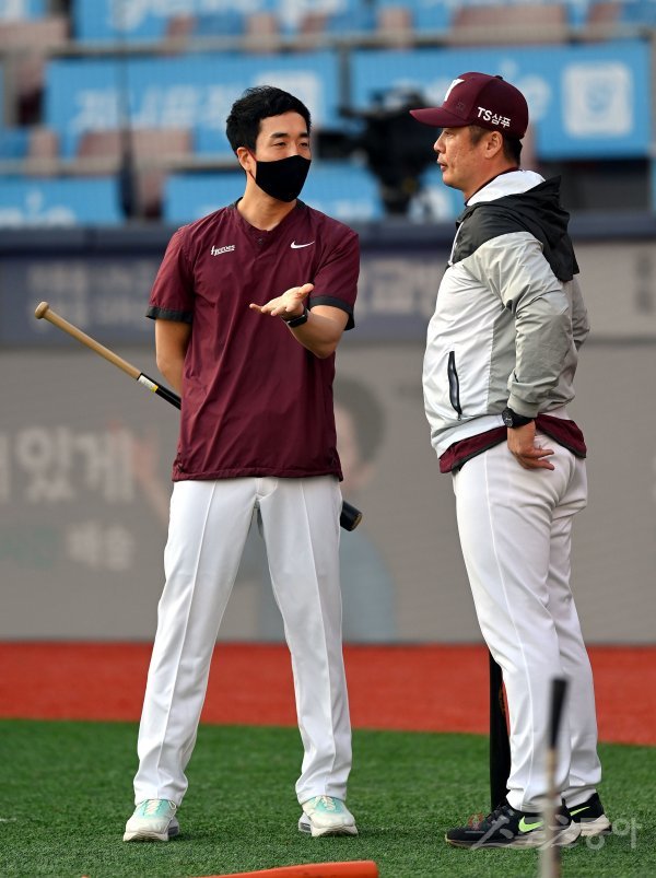 키움 김창현 감독대행이 강병식 코치와 이야기를 나누고 있다.