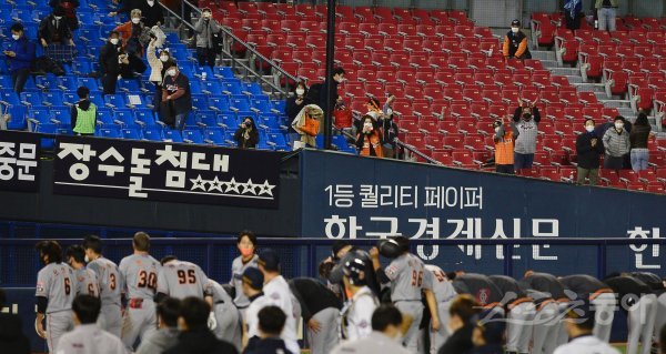 한화가 두산에 0-5로 패배한 뒤 선수들이 관중석에 인사하고 있다.