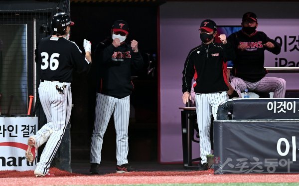 5회초 무사에서 LG 이형종이 솔로 홈런을 쏘아 올린 뒤 류중일 감독의 환영을 받고 있다.