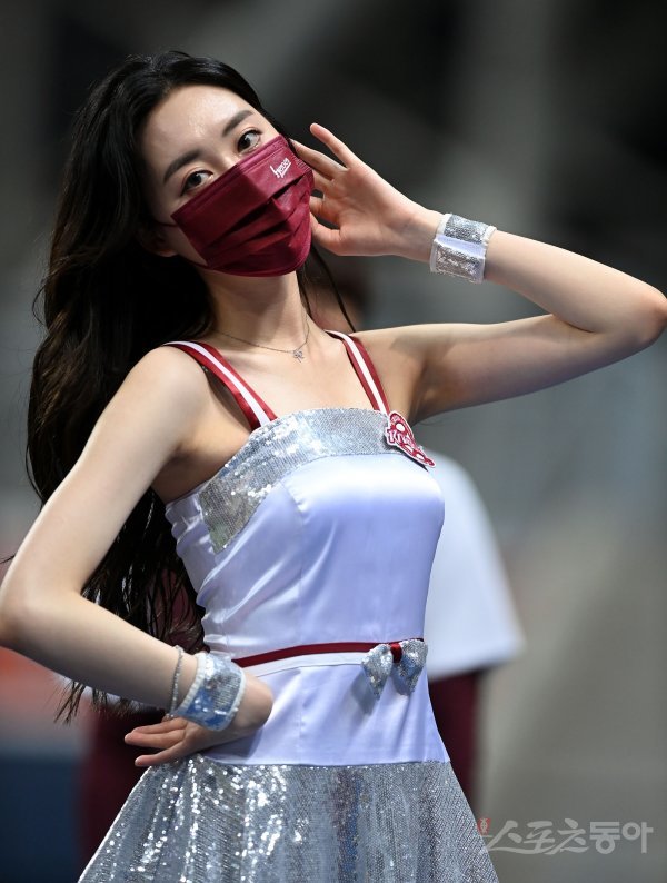 키움 치어리더가 카메라를 향해 포즈를 취하고 있다.