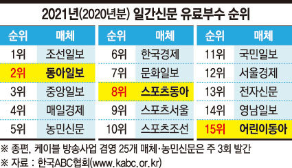 동아일보의 유료부수는 70만5198부로 집계돼 전체 언론사 가운데 2위였다. 발행부수는 84만2100부로 집계됐다. 어린이동아의 유료부수는 4만8385부로 어린이신문 중 가장 높았다.