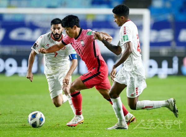 7일 경기도 수원월드컵경기장에서 열린 ‘2022 카타르월드컵’ 아시아 최종예선 한국과 레바논의 경기에서 한국 황희찬이 레바논 수비수 사이로 돌파하고 있다. 수원 | 김민성 기자 marineboy@donga.com