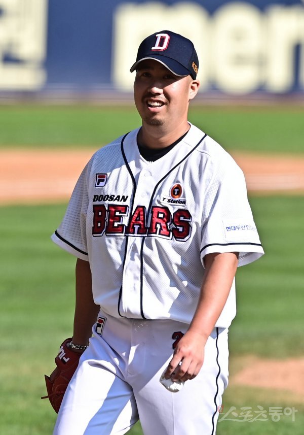 12일 서울 잠실야구장에서 열린 ‘2021 신한은행 SOL KBO리그’에서 두산 베어스와 LG 트윈스의 더블헤더 1차전 경기에서 4회초 수비를 마친 뒤 두산 투수 유희관이 웃고 있다.
