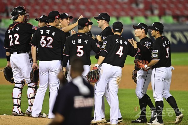 14일 서울 잠실야구장에서 열린 ‘2021 신한은행 SOL KBO리그’에서 두산 베어스와 KT 위즈의 경기에서 KT가 두산에 4-3으로 승리를 거둔 뒤 선수들이 기쁨을 나누고 있다.