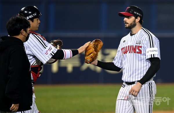 4일 서울 잠실야구장에서 ‘2021 신한은행 SOL KBO리그’ LG 트윈스와 두산 베어스의 준PO 1차전 경기가 열렸다. 5회초 2사 3루에서 LG 선발 수아레즈가 교체되고 있다.