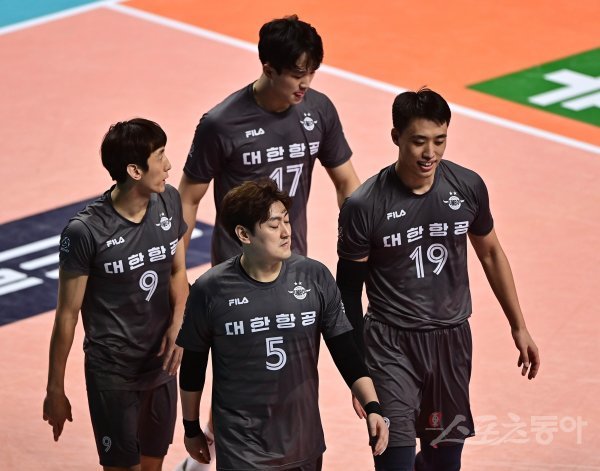 2일 서울 장충체육관에서 열린 ‘2021~2022 도드람 V-리그’ 남자부 서울 우리카드와 인천 대한항공의 경기에서 대한항공 선수들이 1세트를 내준 뒤 아쉬워하고 있다. 장충 | 주현희 기자 teth1147@donga.com