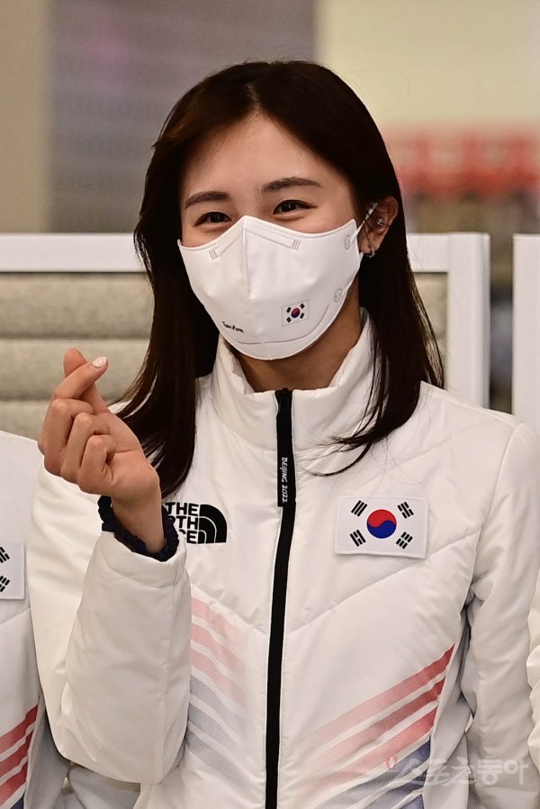 ‘2022 제24회 베이징동계올림픽대회’를 마친 쇼트트랙 대표팀 김아랑이 18일 인천국제공항 2터미널을 통해 귀국한 뒤 포즈를 취하고 있다.