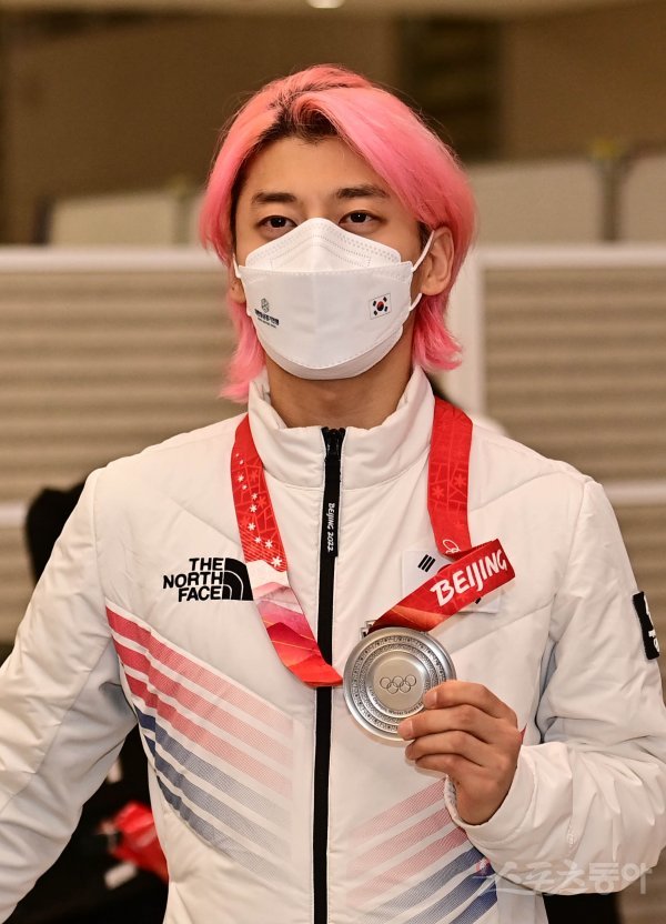 ‘2022 제24회 베이징동계올림픽대회’를 마친 쇼트트랙 대표팀 곽윤기가 18일 인천국제공항 2터미널을 통해 귀국한 뒤 포즈를 취하고 있다.