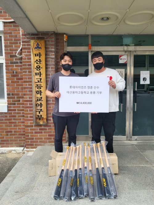 정훈은 지난달 25일 모교 마산 용마고등학교 야구부에 1400만 원 상당의 야구용품을 기부했다. 겨울이면 이대호, 한동희 등 롯데 동료들과 연탄 배달 봉사에 나서던 그가 이번에는 모교 후배들을 위해 팔을 걷어붙였다.