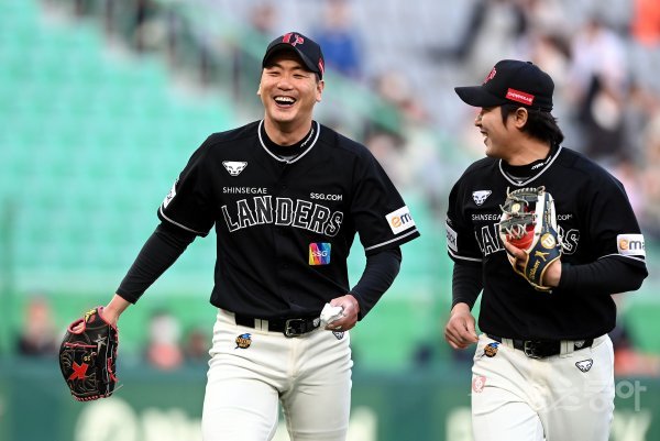 3일 인천 SSG 랜더스필드에서 ‘2022 신한은행 SOL KBO리그’ SSG 랜더스와 한화 이글스의 경기가 열렸다. SSG 선발투수 김광현이 2회초 한화 공격을 삼자범퇴로 막은 후 더그아웃으로 향하며 최정과 이야기를 나누고 있다.