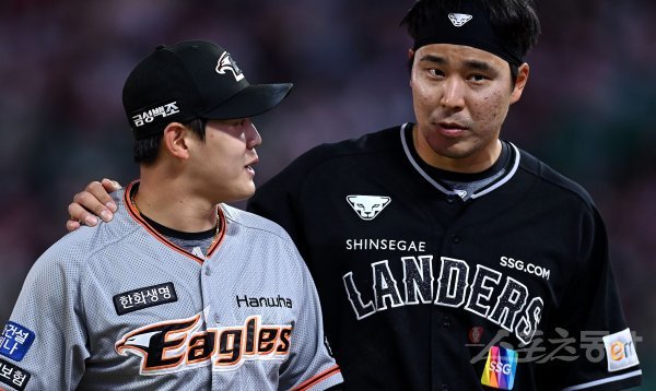 3일 인천 SSG 랜더스필드에서 ‘2022 신한은행 SOL KBO리그’ SSG 랜더스와 한화 이글스의 경기가 열렸다. 4회말 이닝 종료 후 SSG 한유섬이 한화 선발 윤대경과 이야기를 나누고 있다.