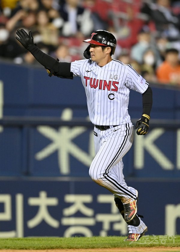 3일 서울 잠실야구장에서 ‘2022 신한은행 MY CAR KBO리그’ 두산 베어스와 LG 트윈스 경기가 열렸다. 5회말 무사 LG 오지환이 동점 우월 솔로 홈런을 날리고 그라운드를 돌며 하이파이브 하고 있다.