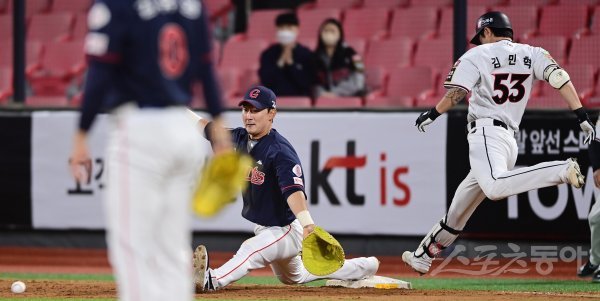 3일 경기도 수원KT위즈파크에서 열린 ‘2022 신한은행 SOL KBO리그’ KT 위즈와 롯데 자이언츠의 경기에서 6회초 2사 2루 KT의 내야 땅볼 때 롯데 1루수 김민수가 송구된 볼을 향해 미트를 뻗고 있다.