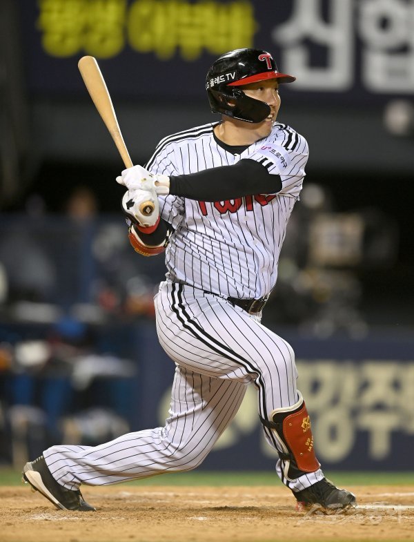 3일 서울 잠실야구장에서 ‘2022 신한은행 MY CAR KBO리그’ 두산 베어스와 LG 트윈스 경기가 열렸다. 8회말 무사 1루 LG 김현수가 우전 2루타를 치고 있다.