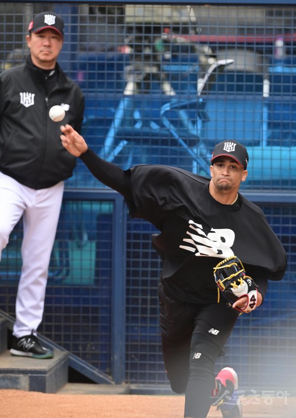 8일 서울 잠실야구장에서 열린 ‘2022 신한은행 SOL KBO리그’ 두산 베어스와 KT 위즈의 경기에 앞서 KT 쿠에바스가 불펜 피칭을 하고 있다.