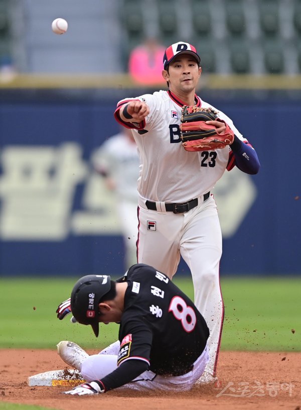 8일 서울 잠실야구장에서 열린 ‘2022 신한은행 SOL KBO리그’ 두산 베어스와 KT 위즈의 경기에서 4회초 1사 1, 2루 KT의 내야 땅볼 때 두산 2루수 강승호가 1루주자를 포스 아웃시킨 후 1루로 송구하고 있다.