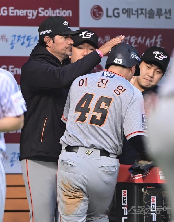 10일 서울 잠실야구장에서 열린 ‘2022 신한은행 SOL KBO리그’ LG 트윈스와 한화 이글스의 경기에서 3회초 무사 2루 한화의 좌전 2루타 때 한화 수베로 감독이 득점에 성공한 이진영을 축하하고 있다.