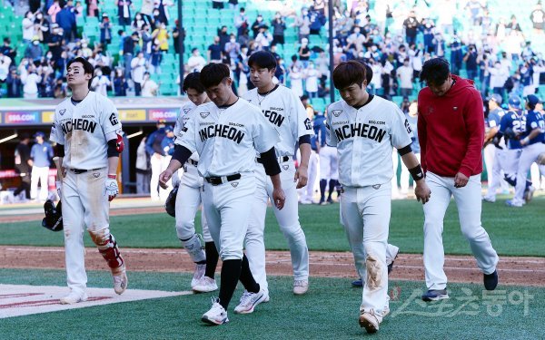 15일 인천 SSG 랜더스필드에서 ‘2022 신한은행 SOL KBO리그’ SSG 랜더스와 NC 다이노스의 경기가 열렸다. NC에 7-8로 역전패 당한 SSG 선수들이 그라운드를 빠져나가고 있다.