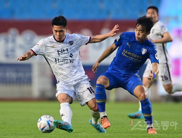 17일 경기도 수원월드컵경기장에서 열린 ‘하나원큐 K리그1 2022’ 수원 삼성과 김천 상무의 경기에서 김천 명준재가 수원 강현묵의 수비를 피해 드리블 하고 있다.