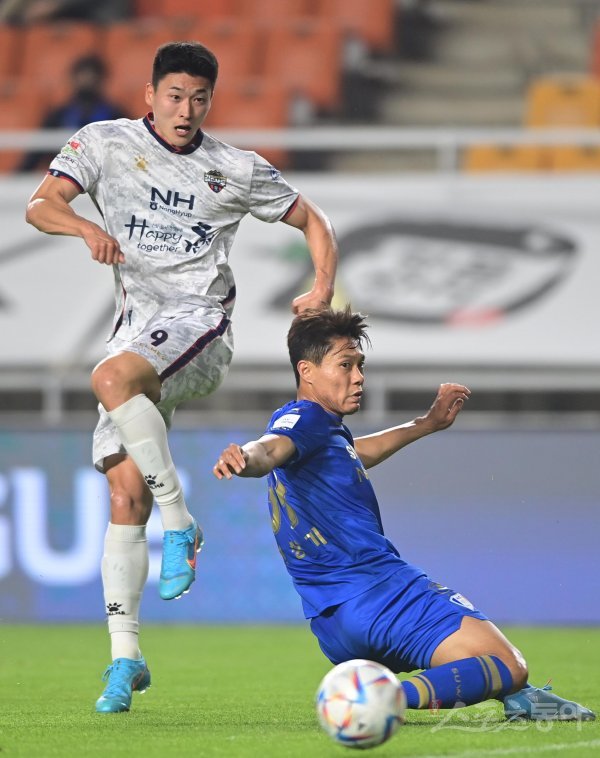 17일 경기도 수원월드컵경기장에서 열린 ‘하나원큐 K리그1 2022’ 수원 삼성과 김천 상무의 경기에서 김천 조규성이 슈팅을 하고 있다.