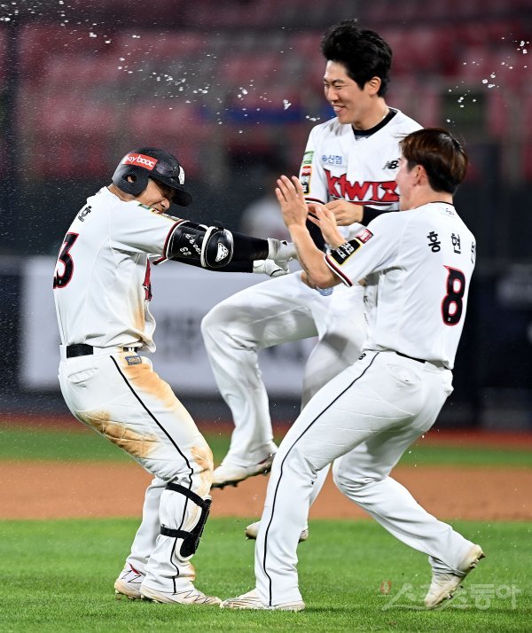 17일 경기도 수원kt위즈파크에서 ‘2022 신한은행 SOL KBO리그’ kt 위즈와 LG 트윈스의 경기가 열렸다. 9회말 1사 1루에서 kt 조용호가 끝내기 2루타를 날린 후 동료들의 환영을 받고 있다.
