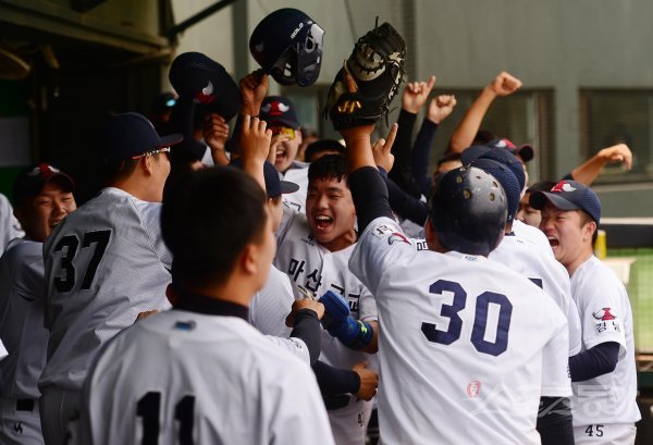 19일 서울 목동야구장에서 열린 ‘제76회 황금사자기 전국고교야구대회 겸 주말리그 왕중왕전’ 마산고와 세광고의 경기에서 9회초 1사 3루 마산고 신성호의 우전 적시타 때 3루주자 신용석이 득점에 성공한 후 동료들과 기쁨을 나누고 있다.