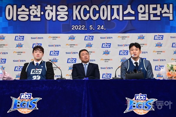 24일 서울 강남구 서초동 KCC빌딩에서 열린 ‘KCC 이지스 입단식’ 기자간담회에서 허웅이 질문에 답하고 있다.