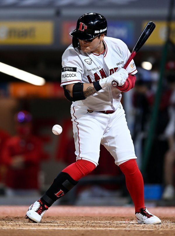 24일 인천 SSG 랜더스필드에서 ‘2022 신한은행 SOL KBO리그’ SSG 랜더스와 롯데 자이언츠의 경기가 열렸다. 8회말 2사에서 SSG 추신수가 몸에 맞는 볼로 출루하고 있다.