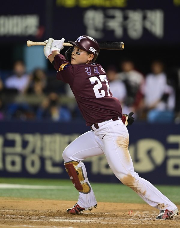 24일 서울 잠실야구장에서 열린 ‘2022 신한은행 SOL KBO리그’ LG 트윈스와 키움 히어로즈의 경기에서 7회초 1사 키움 김태진이 타격을 하고 있다.