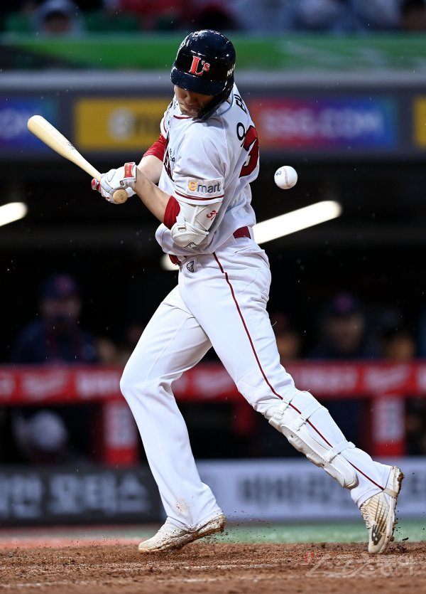 25일 인천 SSG 랜더스필드에서 ‘2022 신한은행 SOL KBO리그’ SSG 랜더스와 롯데 자이언츠의 경기가 열렸다. 4회말 1사 2, 3루에서 SSG 오태곤이 몸에 맞는 볼로 출루하고 있다.