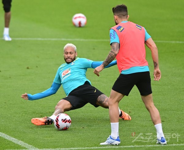 브라질 축구대표팀 네이마르가 30일 경기도 고양종합운동장에서 다음 달 2일 한국과 평가전 대비 훈련에서 태클을 하고 있다.