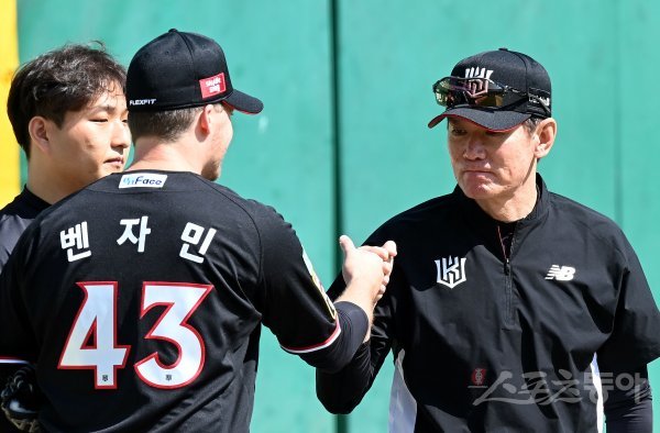1일 인천 SSG 랜더스필드에서 ‘2022 신한은행 SOL KBO리그’ SSG 랜더스와 kt 위즈의 경기가 열린다. 경기 전 kt 이강철 감독이 새 용병 투수 벤자민과 인사를 나누고 있다.