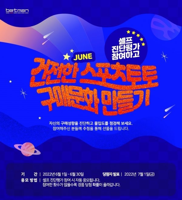 국민체육진흥공단에서 발행하는 체육진흥투표권 스포츠토토의 공식 온라인 발매 사이트 베트맨이 6월 건전화 이벤트인 ‘건전한 스포츠토토 구매문화 만들기!’를 1일(수)부터 30일(목)까지 한 달간 실시한다.스스로 건전구매 습관 만들 수 있는 프로그램 참여 가능