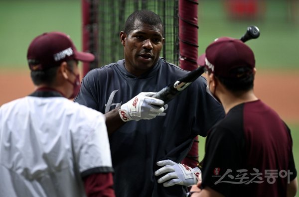 2일 서울 고척스카이돔에서 ‘2022 신한은행 SOL KBO리그’ 키움 히어로즈와 삼성 라이온즈의 경기가 열린다. 경기 전 키움 푸이그가 코치와 이야기를 나누고 있다.